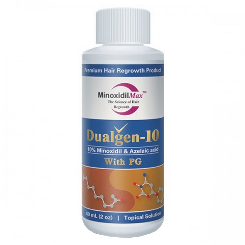 Міноксидил 10% (Dualgen) відноситься до високих концентрацій міноксидилу. До складу дуалгену додатково входить 5% азелаїнова кислота, яка є антиандрогеном. Азелаїнова кислота знижує чутливість волосяних фолікул до гормонів-андрогенів, що є актуальним для чоловіків з андрогенною алопецією (з облисінням за чоловічим типом).