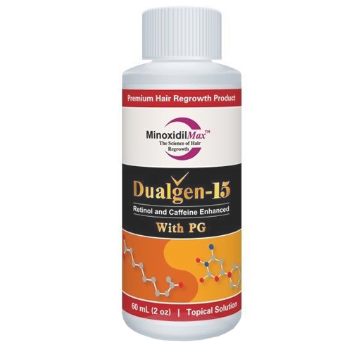 Міноксидил 15% (Dualgen) - препарат із найвищою на сьогоднішній день концентрацією діючої речовини. Як і 10% minoxidil, склад 15% концентрації посилено 5% азелаїновою кислотою. Дуалген 15% слід застосовувати в тих випадках, коли облисіння торкнулося більшої частини поверхні голови, також чоловіки можуть застосовувати 15% minoxidil у тих випадках, коли більш слабкі концентрації не дали позитивних результатів.